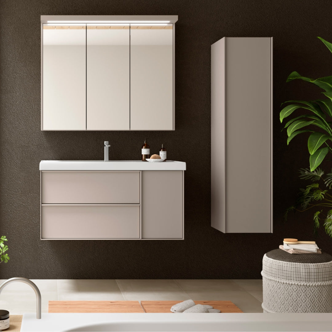 Muebles de baño compactos y a medida. Columnas auxiliares. Lavabos sobreencimera e integrados. Encimeras a medida de solid Surface.